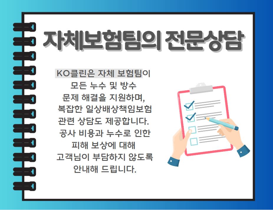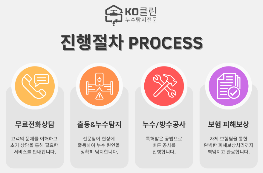 KO클린의 특징은 상담부터 탐지, 공사, 피해보상까지 원스톱으로 해결한다는 점입니다.